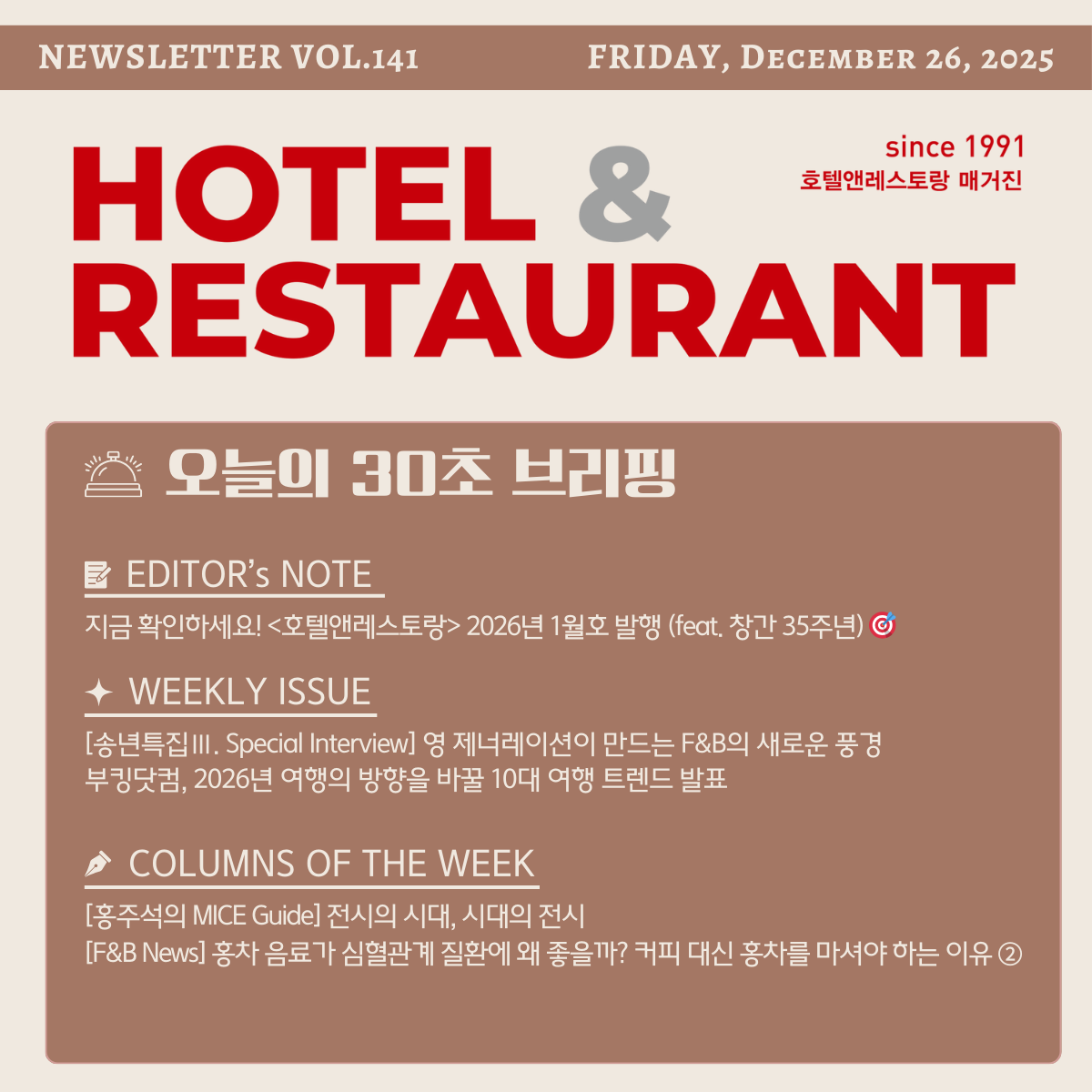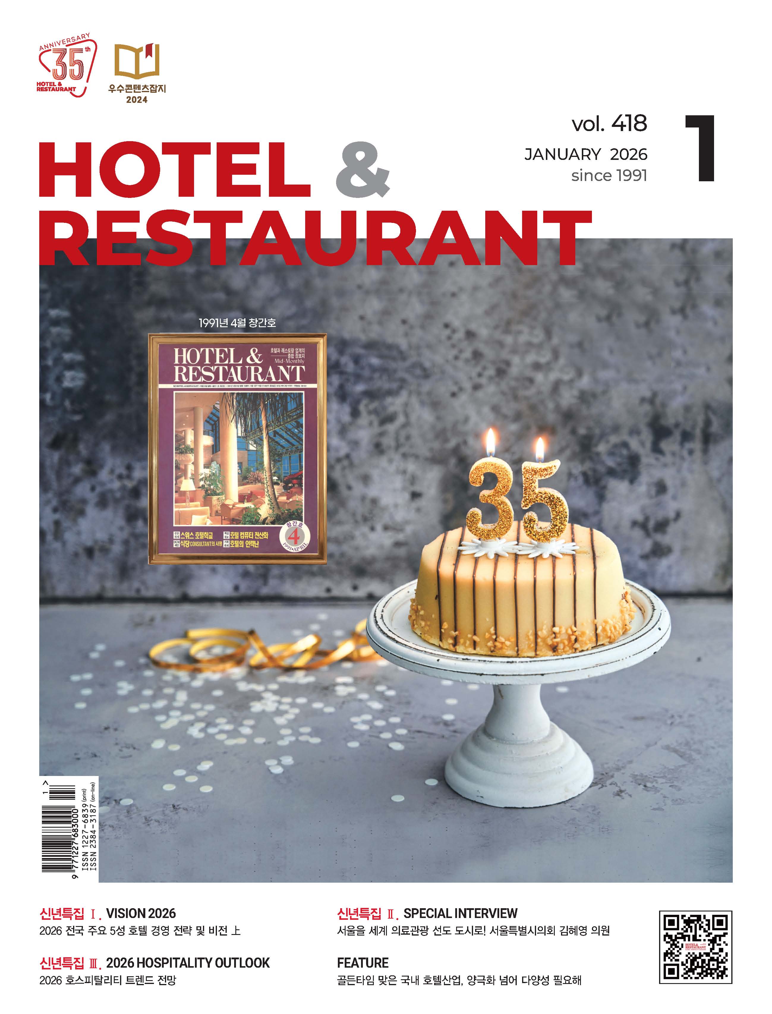 창간 35주년을 맞은 <호텔앤레스토랑>이 독자 여러분과 함께 새로운 도약을 준비합니다. 1991년 4월 창간 이후 35년간 호스피탈리티 업계와 동고동락하며 성장해온 <호텔앤레스토랑>. 2026년 새해에도 업계의 가장 믿음직한 동반자로 함께하겠습니다!